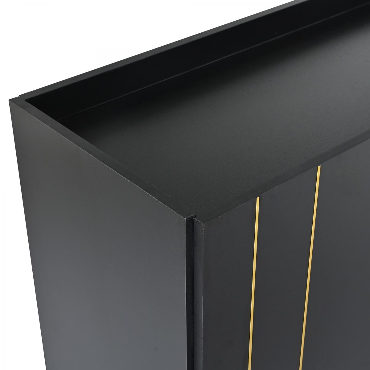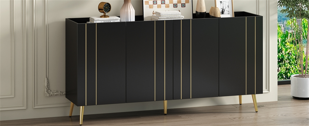- With its unique design details and exceptional taste, this cabinet stands out as a focal point in any living space. The cabinet doors, adorned with gold lines, exudes a subtle yet luxurious ambiance. Furthermore, the five exquisite golden metal legs at the base echo the door's line, further enhancing the harmonious visual beauty.