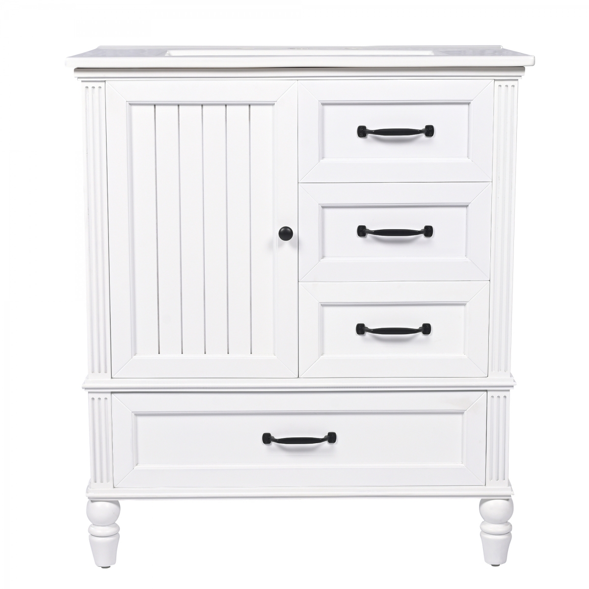 30 Inch  Bathroom Vanity with Sink, Bathroom Cabinet with A Door, Three Drawers, Solid Wood Legs & MDF Board, Adiustable Foot Pads, White
