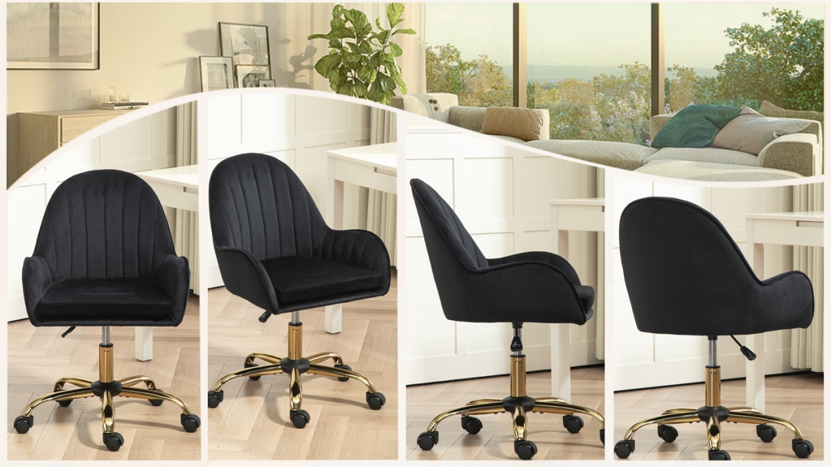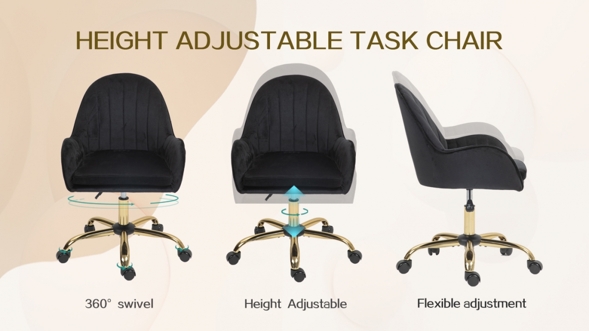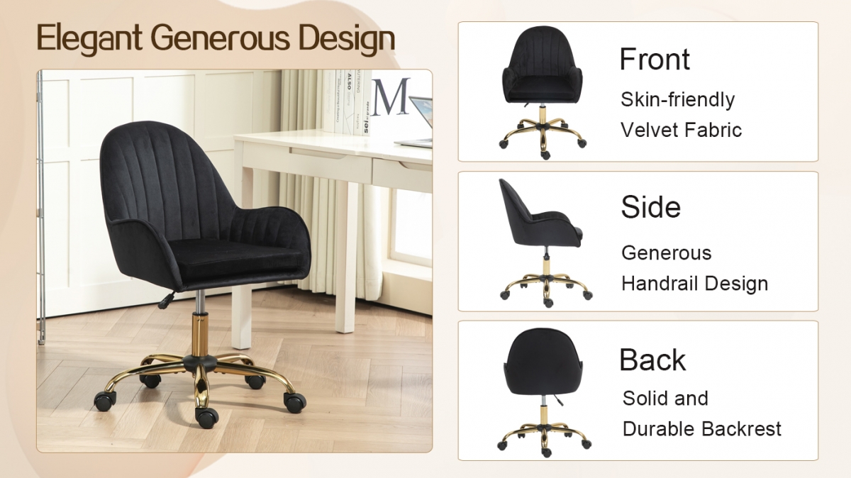 Velvet Home Office Chair with Wheels, Cute Chair with Side Arms and Gold Metal Base for Living Room, Bedroom,and Vanity Room,Bling Desk Nail Desk for Women,Adjustable Height,Black