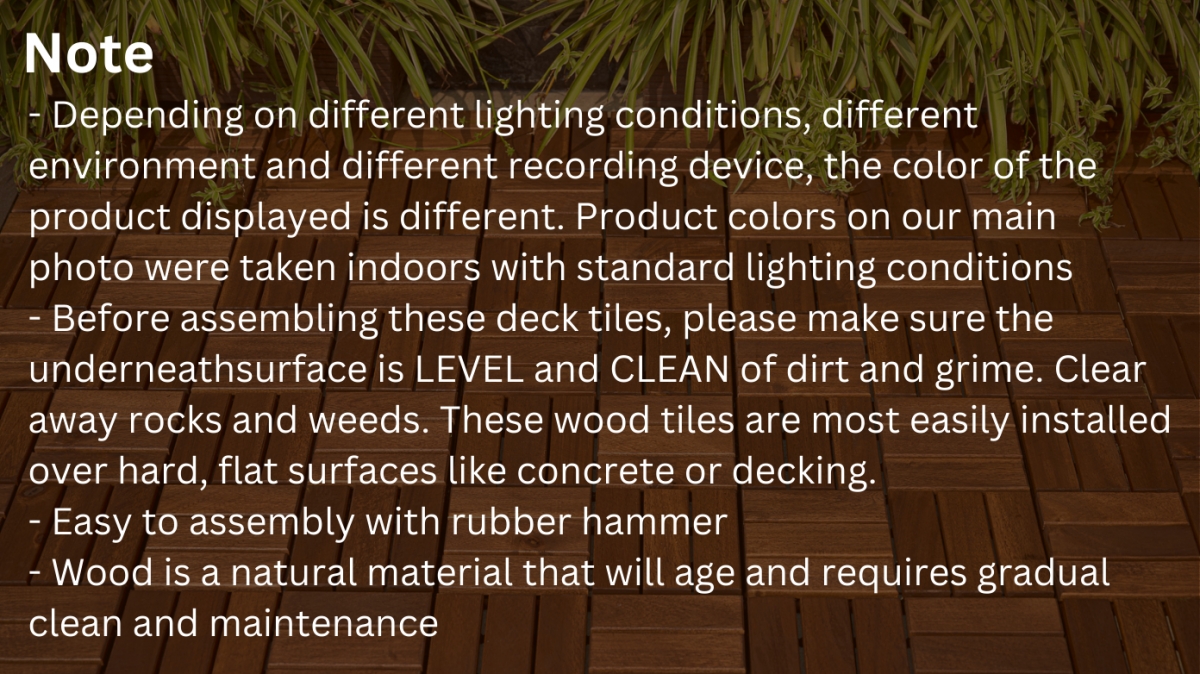 - Waterproof & Anti Mildew and Mold: Wood Deck Tiles were sanded with 240-grit sanding paper and then finished with water-based oil, which helps them Waterproof & Anti Mildew and Mold