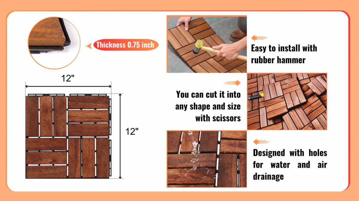 - Perfect Size: Each tile has a square shape of 12 inches x 12 inches with 0.75 inches thickness. The wood part is 0.47 inches thick and the plastic part is 0.28 inches thick enough for drainage during the rainy season.