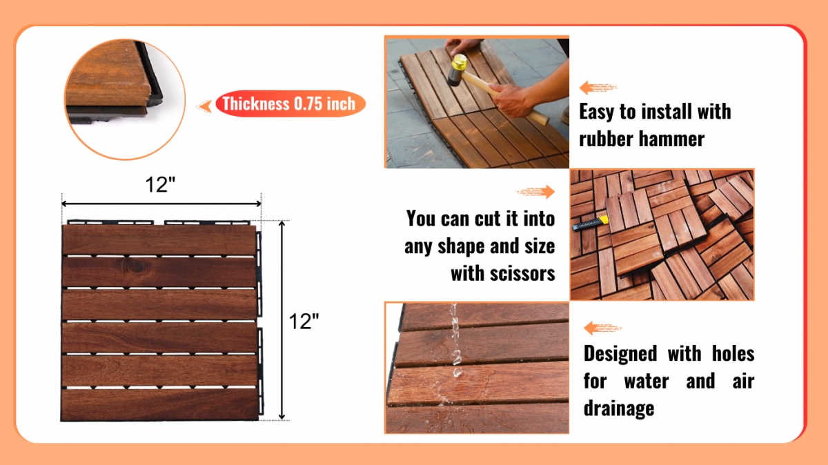 - Perfect Size: Each tile has a square shape of 12 inches x 12 inches with 0.75 inches thickness. The wood part is 0.47 inches thick and the plastic part is 0.28 inches thick enough for drainage during the rainy season.