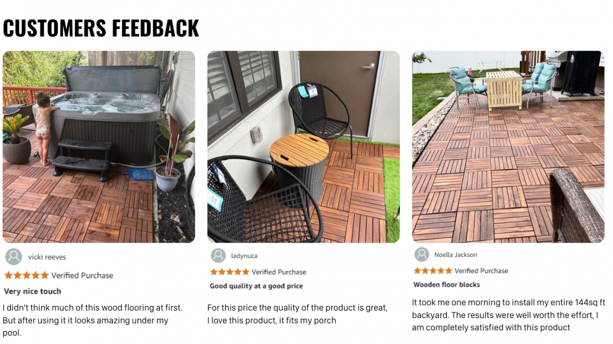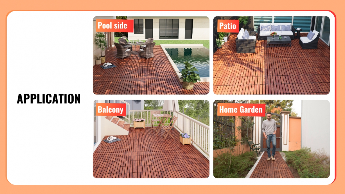 - Waterproof & Anti Mildew and Mold: Wood Deck Tiles were sanded with 240-grit sanding paper and then finished with water-based oil, which helps them Waterproof & Anti Mildew and Mold