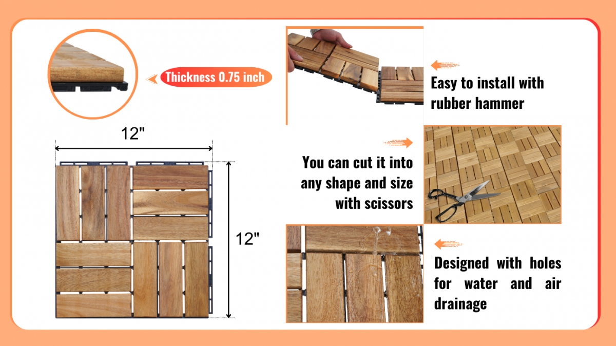 - Perfect Size: Each tile has a square shape of 12 inches x 12 inches with 0.75 inches thickness. The wood part is 0.47 inches thick and the plastic part is 0.28 inches thick enough for drainage during the rainy season.