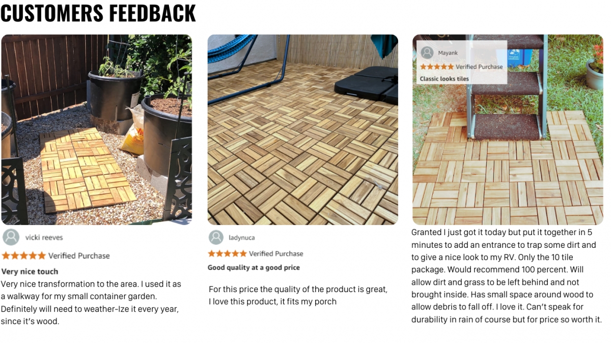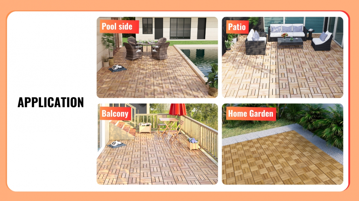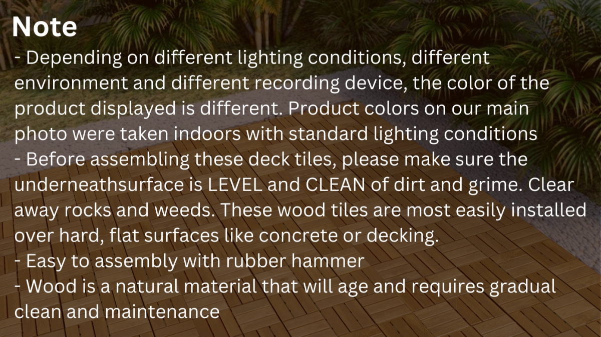 - Waterproof & Anti Mildew and Mold: Wood Deck Tiles were sanded with 240-grit sanding paper and then finished with water-based oil, which helps them Waterproof & Anti Mildew and Mold