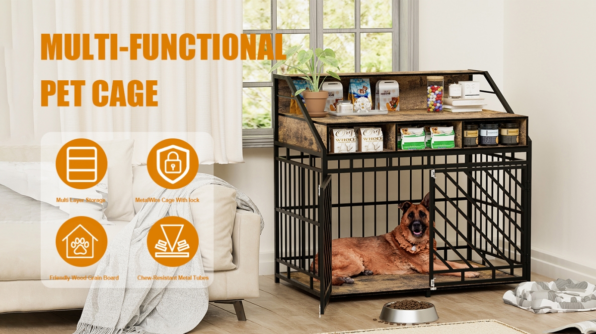 - 【Sturdy and Chew-Resistant】This dog crate furniture is crafted from high-quality wooden boards and " steel tubes. The robust wood-iron structure enhances chew resistance, providing comfort, durability, and easy maintenance. The bottom wooden board structure provides stable support for your dog, ensuring your pet's feet are protected from injury.