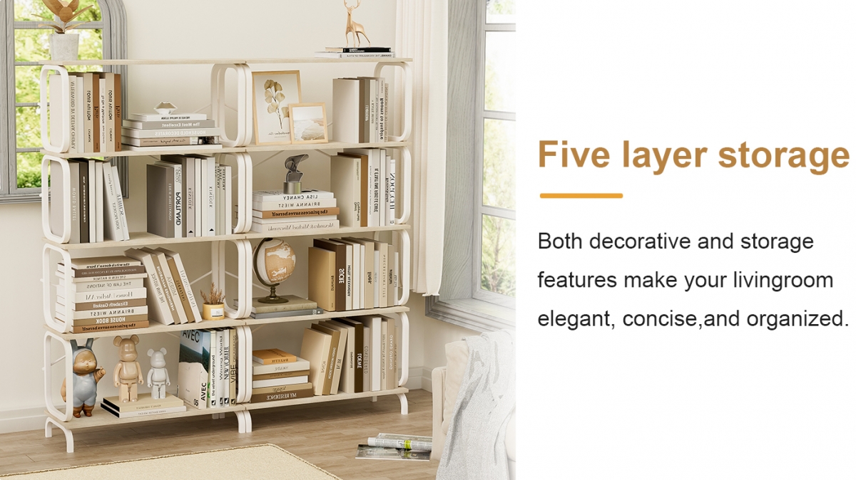 - [Five-tier Shelf Storage] The open design of this bookcase combines the charm of both minimalist and vintage furniture styles. Behind "X" design to stop things falling off and provides plenty of space to display and storage your books, decorations, plants, and other daily accessories.