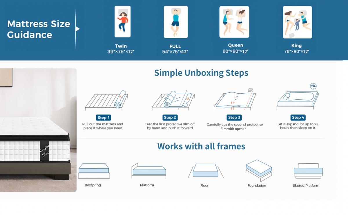 - Mattress in A Box, Easy to Set Up: The 12 Inch queen size mattress is rolled and compressed in a box for shipping. Setting them up at home is an easy task. They are compatible with most of bed frames and can be used without a spring box. Unseal the mattress and let it inflate for about 72 hours for full expansion.