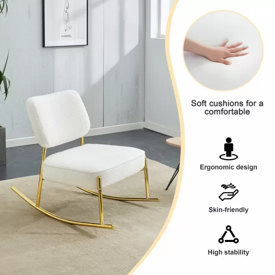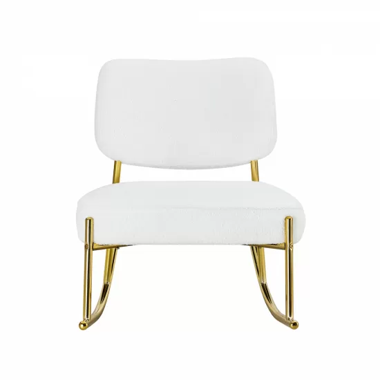 Teddy suede material cushioned rocking chair, unique rocking chair, cushioned seat, white rocking chair with backrest and golden metal legs. Comfortable side chairs in living room, bedroom, office