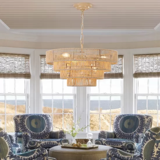 - EYE-CATCHING DESIGN: This woven rattan chandelier is made of wicker woven on natural wood color with high-quality 4 round metal frames finished by iron, forming a semicircular hollow cage, combining modern and traditional feelings to your home.
