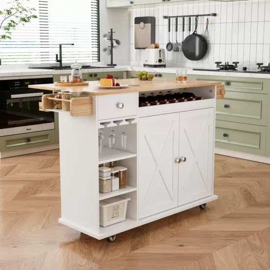 44 Inch Kitchen Island Cart with Solid Wood Top, Wine Storage, Spice Rack, Towel Rack, Wine Glass Holder, Rolling Kitchen Island Table on Wheels, Tool-Free Installation, White & Oak