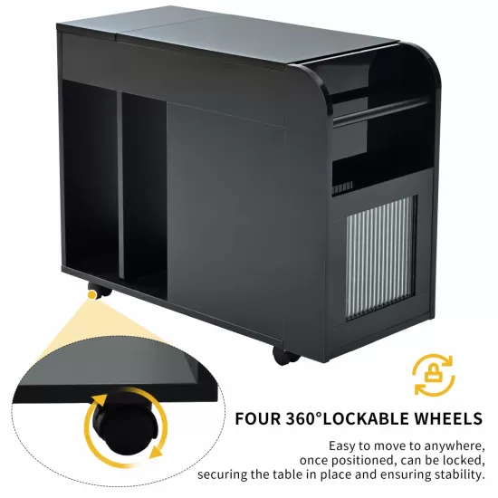 U-Can Multifunctional Extendable End Table with Wheels, Side Table with Tempered glass door, 2 Storage Shelves, 2 Drawers for Living Room, Black